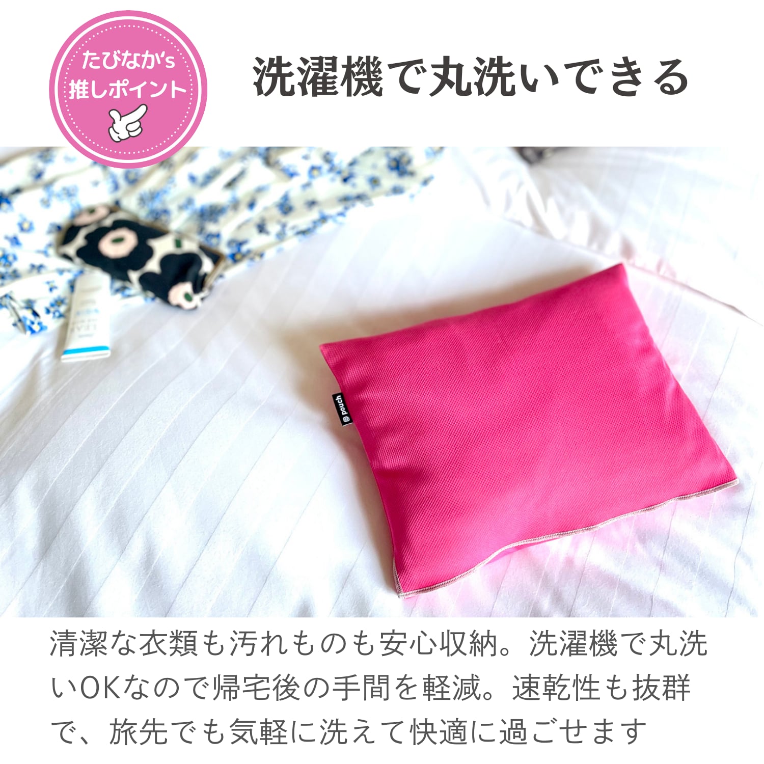 7.洗濯機で丸洗いできる:帰宅後、衣類と一緒に洗濯機へ。速乾性があるので旅先でも洗えます。