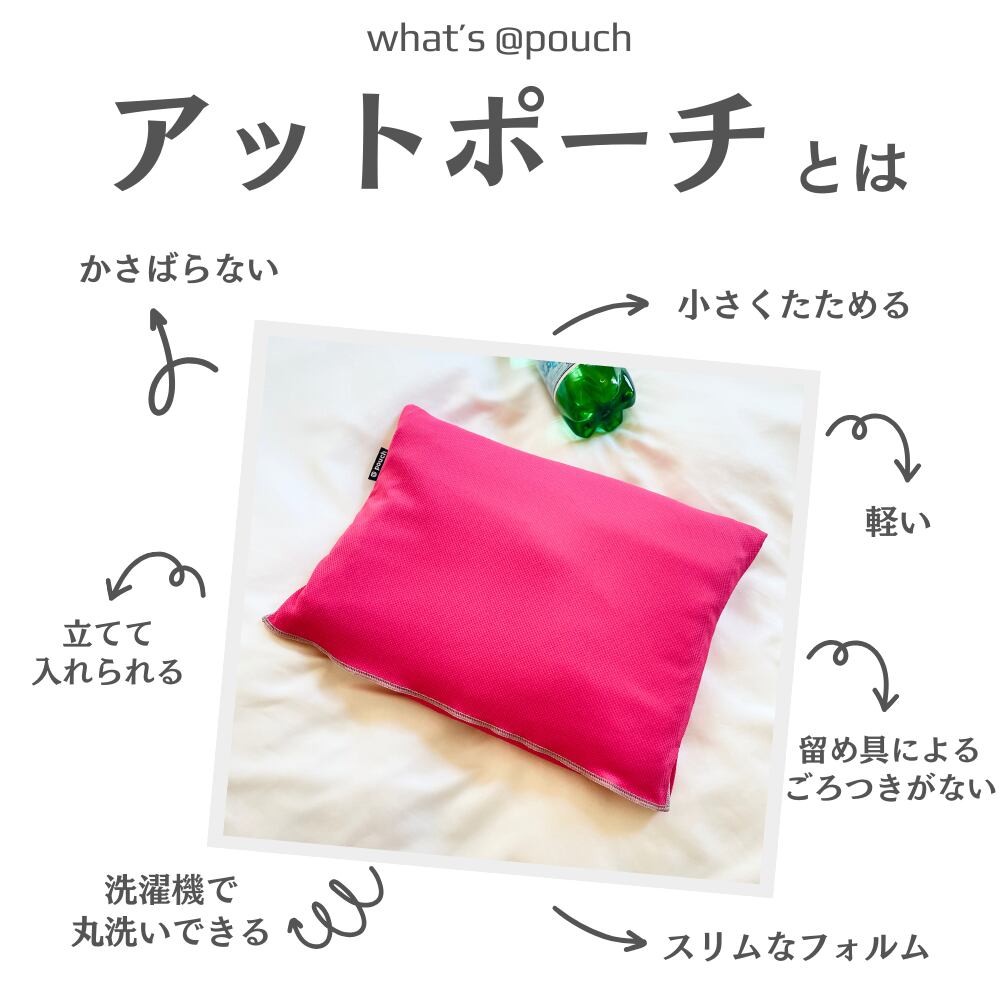 アットポーチが形にしたのは、手のひらに収まるサイズのシンプルなカタチ。細かな小物をすっきりまとめ、汚れたらすぐに洗える清潔さを備えています。